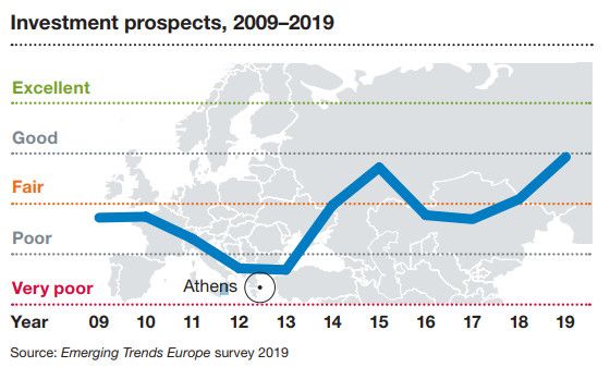 Η κατάταξη της Αθήνας σε συνολικά 31 ευρωπαϊκές πόλεις ενισχύθηκε κατά 15 θέσεις, σε σχέση με την αντίστοιχη έρευνα για τις τάσεις του 2018. Έτσι, από την 29η θέση το 2018, η Αθήνα βρίσκεται στην έρευνα για τις προοπτικές του 2019 στην 14η θέση ως προς την ελκυστικότητα για επενδύσεις σε ακίνητα.