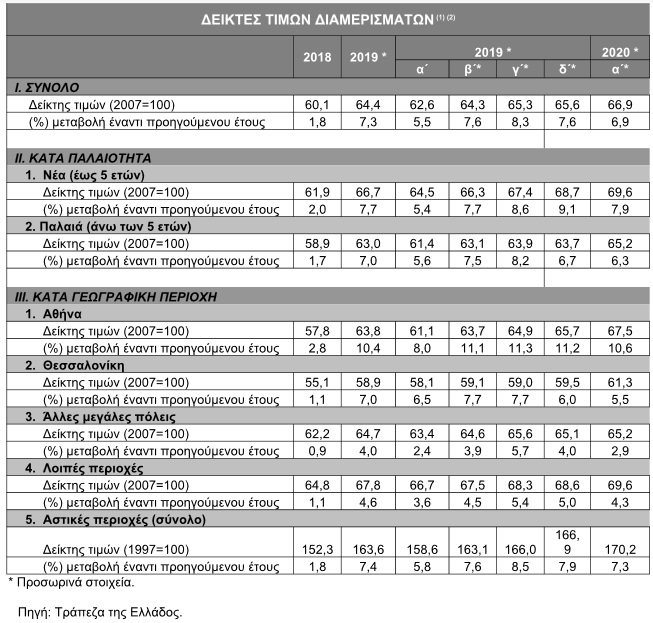 Για το σύνολο του 2019, με βάση τα αναθεωρημένα στοιχεία, η μέση αύξηση των τιμών των διαμερισμάτων στις ίδιες περιοχές σε σχέση με το 2018 ήταν 10,4%, 7,0%, 4,0% και 4,6% αντίστοιχα. Τέλος, για το σύνολο των αστικών περιοχών της χώρας, το α΄ τρίμηνο του 2020 οι τιμές των διαμερισμάτων αυξήθηκαν κατά 7,3% σε σύγκριση με το α΄ τρίμηνο του 2019, ενώ, για το σύνολο του 2019, η μέση ετήσια αύξηση διαμορφώθηκε σε 7,4%, έναντι αύξησης κατά 1,8% το 2018.
