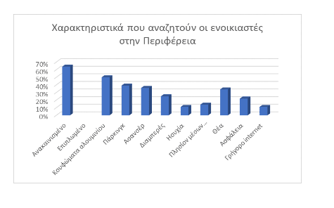 Τα βασικά χαρακτηριστικά επιλογής ενός ακινήτου στην περιφέρεια δεν διαφέρουν σημαντικά σε σύγκριση με αυτά της Αττικής και της Θεσσαλονίκης. Η ανακαίνιση παίζει το σημαντικότερο ρόλο (64%) και ακολουθούν η κατάσταση των κουφωμάτων (50%) και η θέση parking (39%).