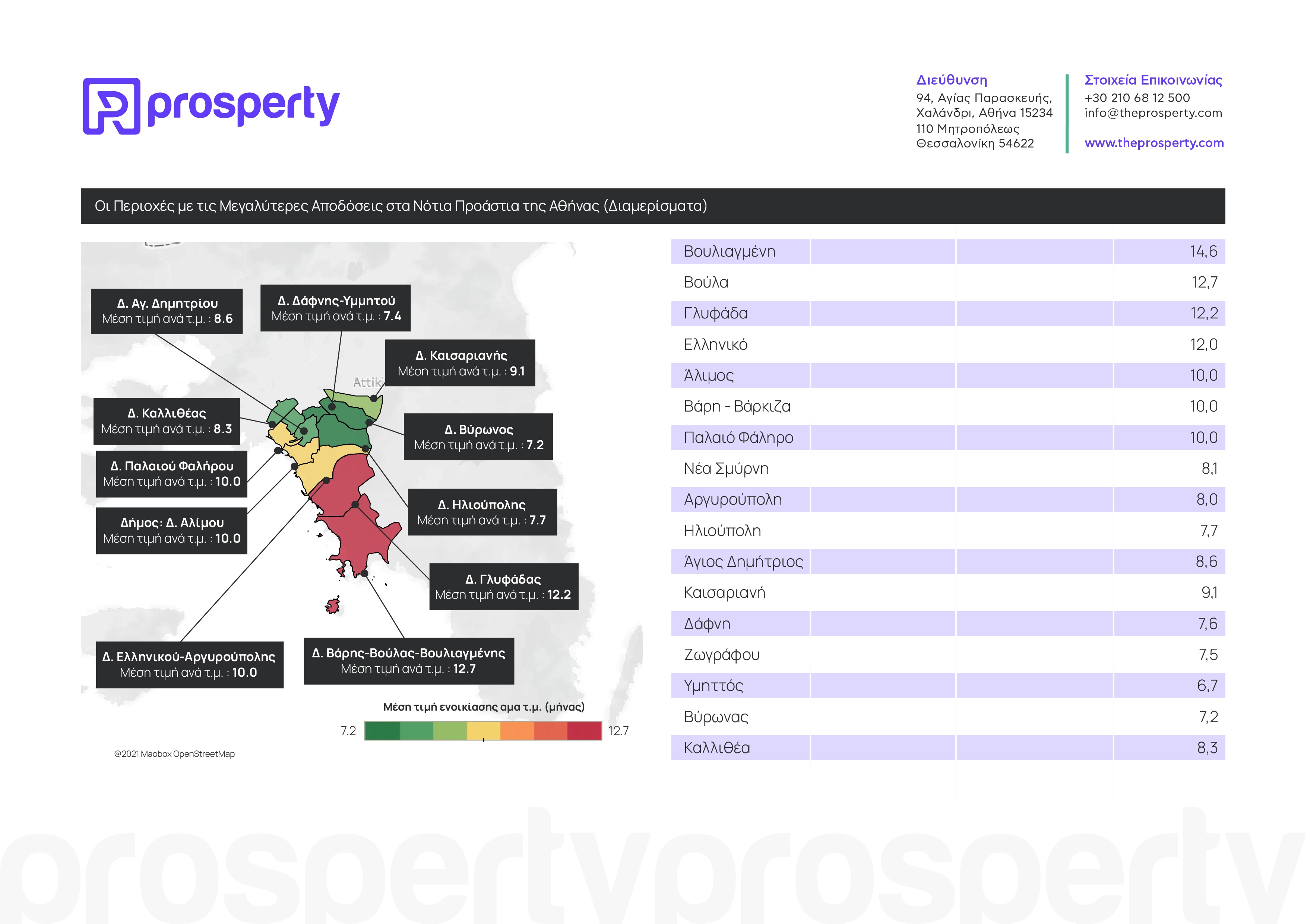 Χαμηλότερες αποδόσεις καταγράφονται στην Καισαριανή (9,1 ευρώ ανά τ.μ.), τον Άγιο Δημήτριο (8,6 ευρώ ανά τ.μ.), την Καλλιθέα (8,3 ευρώ ανά τ.μ.) τη Νέα Σμύρνη (8,1 ευρώ ανά τ.μ.) και στην Αργυρούπολη (8,0 ευρώ ανά τ.μ.).