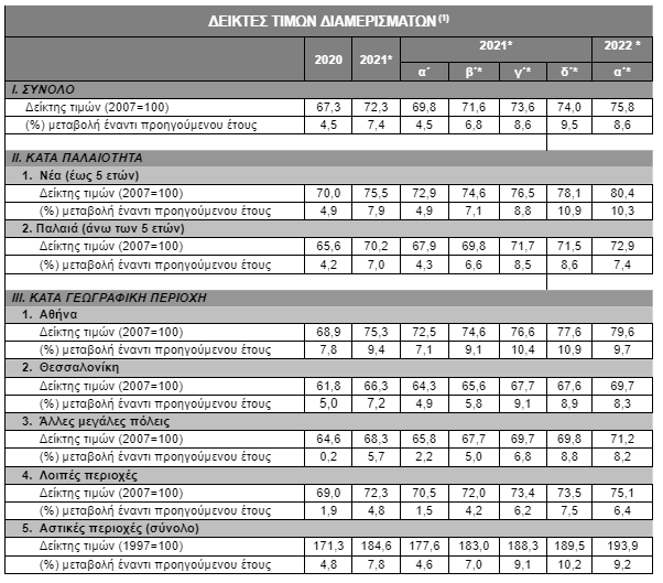 Τέλος, για το σύνολο των αστικών περιοχών της χώρας, το α΄ τρίμηνο του 2022 οι τιμές των διαμερισμάτων αυξήθηκαν σε σύγκριση με το α΄ τρίμηνο του 2021 κατά 9,2%, ενώ για το 2021 η μέση ετήσια αύξηση διαμορφώθηκε στο 7,8% (αναθεωρημένα στοιχεία).