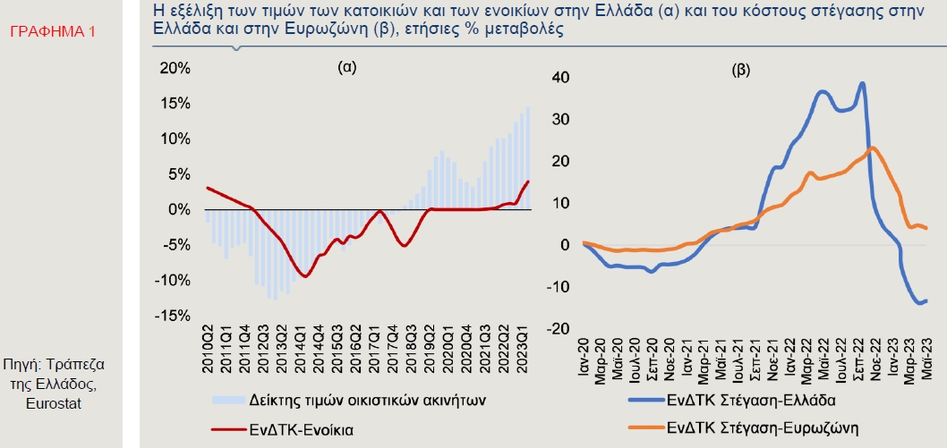 Όπως σημειώνει η Διεύθυνση Οικονομικών Μελετών της τράπεζας, από τις αρχές του 2023 καταγράφεται στη χώρα μας σημαντική πτώση του κόστους στέγασης, το οποίο προσεγγίζεται από τη σχετική υποκατηγορία του Εναρμονισμένου Δείκτη Τιμών Καταναλωτή (ΕνΔΤΚ) και περιλαμβάνει, μεταξύ άλλων, το κόστος θέρμανσης και συντήρησης και το ενοίκιο.