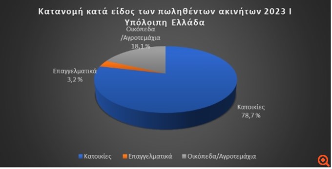 Βάσει της λεπτομερούς ανάλυσης των στοιχείων της RE/MAX Ελλάς για την κατανομή των πωλήσεων ακινήτων σε πανελλαδικό επίπεδο, το 83,7% του συνολικού αριθμού ακινήτων που πωλήθηκαν αντιστοιχούσαν σε κατοικίες (διαμερίσματα / μονοκατοικίες / μεζονέτες). Από την άλλη, τα οικόπεδα-αγροτεμάχια και τα επαγγελματικά ακίνητα αφορούσαν πολύ μικρότερο ποσοστό, της τάξης του 12,8% και 3,5% αντίστοιχα. (γράφημα 1).