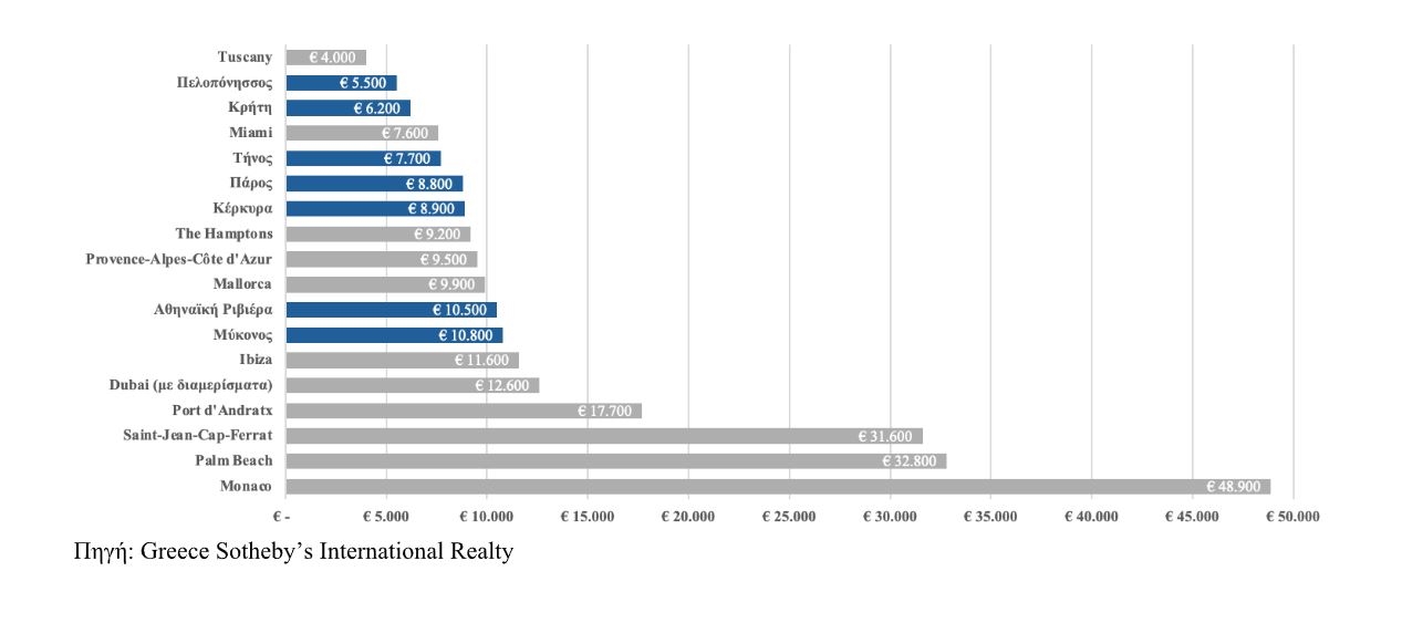 Ενδιαφέρον παρουσιάζει και η σύγκλιση τιμών που παρατηρείται πλέον, ανάμεσα σε διάφορες περιοχές της χώρας και τους αντίστοιχους ευρωπαϊκούς προορισμούς. Για παράδειγμα, η μέση τιμή στην Μύκονο διαμορφώνεται σε 10.800 ευρώ/τ.μ. και στην Ίμπιζα σε 11.600 ευρώ/τ.μ., ενώ στην Αθηναϊκή Ριβιέρα, το κόστος διαμορφώνεται σε 10.500 ευρώ/τ.μ. και στο Ντουμπάι σε 12.600 ευρώ/τ.μ. (σε παράκτιες αναπτύξεις). Στην Κέρκυρα, η μέση τιμή διαμορφώνεται σε 8.900 ευρώ/τ.μ., ενώ στην Μαγιόρκα σε 9.900 ευρώ/τ.μ. Αντίστοιχα, σε ό,τι αφορά ηπειρωτικούς προορισμούς, στην Πελοπόννησο η μέση τιμή πώλησης αγγίζει τα 5.500 ευρώ/τ.μ., έναντι 4.000 ευρώ/τ.μ. στην Τοσκάνη.