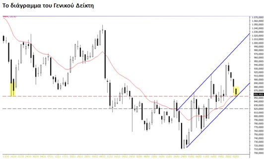 Η σημερινή συνεδρίαση θεωρείται καθοριστική καθώς είτε η αγορά θα βρει τις δυνάμεις να αντιδράσει ανοδικά και να επιχειρήσει να τερματίσει τη διόρθωσή της κρατώντας ζωντανό το ανοδικό σενάριο, είτε θα διασπάσει επιβεβαιωμένα τις 855-845 μονάδες και θα βάλει πλώρη για χαμηλότερες τιμές, με επόμενο κομβικό σημείο τις 820 μονάδες σύμφωνα με τους αναλυτές. Μέχρι και χθες ο Γενικός Δείκτης είχε διορθώσει κατά 38,2% την ανοδική του κίνηση από τις 708 μέχρι τις 945 μονάδες, ο FTSE Large Cap έχει χάσει σχεδόν το ήμισυ των κερδών του (στις 247 μονάδες το 50% ), ενώ ο τραπεζικός δείκτης που επίσης διέσπασε το ανοδικό κανάλι του, έχει ήδη χάσει πάνω από το 61,8% των κερδών του από τα χαμηλά των 532 μονάδων.
