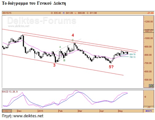 Προς το παρόν τα διαγραμματικά περιθώρια ανοχής στο σενάριο συνέχισης της πλάγιας κίνησης που ξεκίνησε από τα υψηλά της 7ης Μαϊου έχουν ως πρώτο σκαλοπάτι τις 804-805 μονάδες από όπου διέρχεται οι εκθετικός κινητός μέσος όρος των 20 ημερών, όμως πραγματική ζημιά στην παρούσα ανοδική κίνηση θα επέλθει σύμφωνα με τον αναλυτή Στέφανο Γεωργίου (www.deiktes.net) μόνο με τη διάσπαση των ελάχιστων τιμών της 6ης Μαΐου στις 780 μονάδες και αντίστοιχα για τον FTSE Large Cap στις 232 μονάδες.