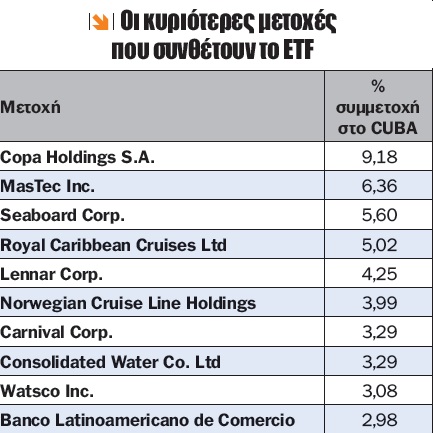 Για όποιον πιστεύει στη δυτικοποίηση της κουβανέζικης οικονομίας, η αμερικανική εταιρεία επενδύσεων Thomas J. Herzfeld Advisors διαθέτει ETF που τοποθετείται σε ενεργητικά στοιχεία με έκθεση σε Κούβα και Τζαμάικα (κωδ. CUBA στο NASDAQ). Από τη στιγμή που Ομπάμα και Κάστρο έδωσαν τα χέρια τους στα τέλη του 2014, το ETF έχει καταγράψει απόδοση άνω του 18%, με την ετήσια απόδοση να φτάνει το 42%.