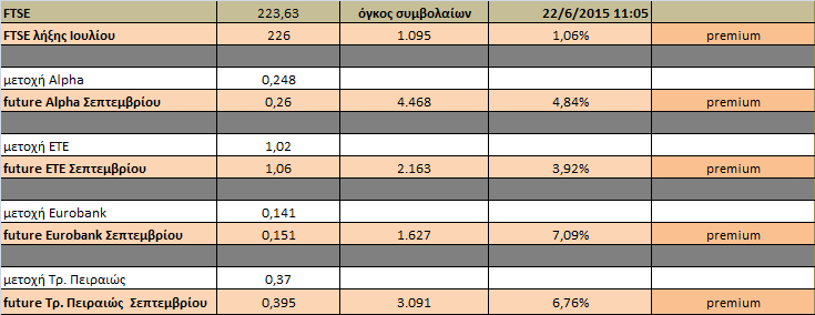 Με premium διαπραγματεύονται οι συναλλαγές στα προθεσμιακά συμβόλαια τόσο του δείκτη FTSE όσο και στα μετοχικά συμβόλαια, με αυτό της Alpha Bank παράδοσης Σεπτεμβρίου να κινείται 6,45% υψηλότερα της υποκείμενης αξίας.Ο τζίρος της spot αγοράς διαμορφώνεται σε υψηλά επίπεδα στα 99 εκατ. ευρώ.