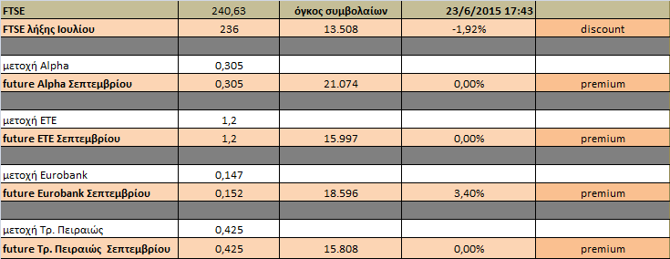 Στην αγορά παραγώγων, το συμβόλαιο του δείκτη μεγάλης κεφαλαιοποίησης πέρασε σε Discount το οποίο διευρύνθηκε σημαντικά προς τη λήξη της συνεδρίασης ενώ στα μετοχικά συμβόλαια μόνο η Eurobank διατήρησε το premium έναντι της υποκείμενης μετοχής.