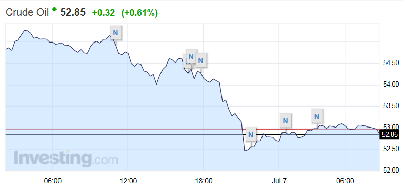 Το προθεσμιακό συμβόλαιο του αργού, παράδοσης Αυγούστου, ανακάμπτει 0,61% στα 52,85 δολάρια το βαρέλι και το Brent παράδοσης Αυγούστου ενισχύεται αυτήν την ώρα 0,48% στα 57,09 δολάρια το βαρέλι.