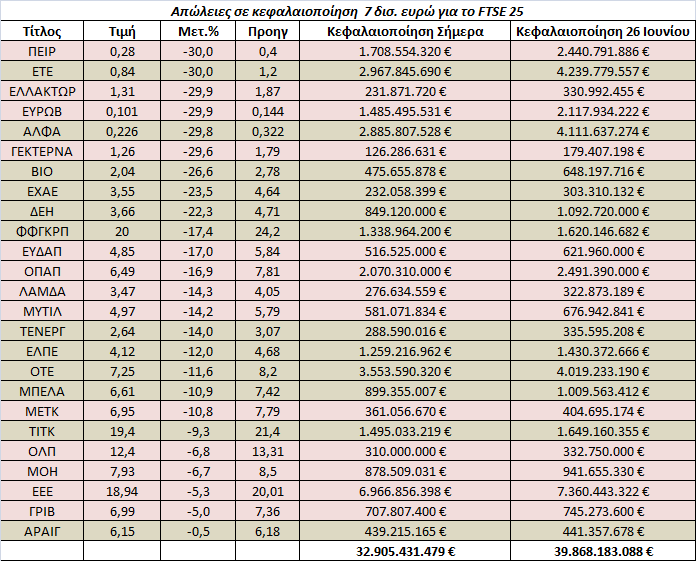 Μόνο από τις 25 μετοχές που απαρτίζουν τη μεγάλη κεφαλαιοποίηση, οι απώλειες σε κεφαλαιοποίηση άγγιξε τα 7 δισ. ευρώ!