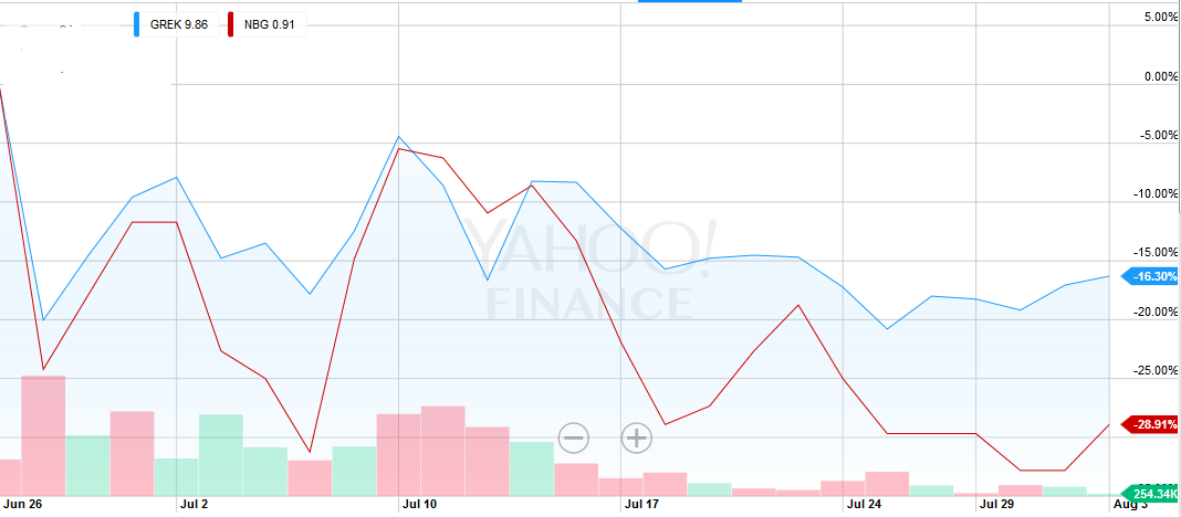 Στη σημερινή συνεδρίαση, η οποία γράφτηκε στην Ιστορία, οι απώλειες που σημειώθηκαν στην Εθνική Τράπεζα και στο δείκτη μεγάλης κεφαλαιοποίησης ήταν αντίστοιχες με τις απώλειες που κατέγραψαν το διάστημα που παρέμεινε κλειστό το Χ.Α., η μετοχή της ΕΤΕ στη Νέα Υόρκη αλλά και το ETF του δείκτη μεγάλης κεφαλαιοποίησης, GREK.