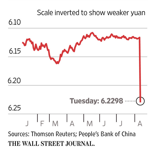 Μία υποτίμηση της τάξης του 2% στο γουαν θεωρείται μεγάλη κίνηση για την Κίνα. Μέχρι σήμερα, το νόμισμα ήταν κλειδωμένο σε ένα υπερβολικά στενό εύρος διακύμανσης από το Μάρτιο, με τις ημερήσιες μεταβολές να διακυμαίνονται μόνο κατά 0,3%.