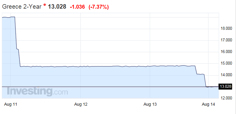 Δεν παρατηρείται κάτι αξιόλογο στην αγορά παραγώγων, ενώ σημαντική αποκλιμάκωση παρατηρείται στις αποδόσεις των ελληνικών ομολόγων, με την καμπύλη των αποδόσεων να εξομαλύνεται. Η απόδοση στο 3ετές διαμορφώνεται στο 13,03% από 14,06% χτες, στο 5ετές υποχωρεί στο 12,77% από 13,18%, ενώ στην 10ετία η απόδοση διαμορφώνεται στο 10,05% από 10,15% χτες.