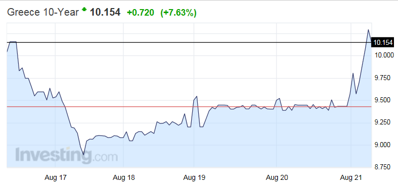 Η απόδοση στο 3ετές ομόλογο ενισχύεται 19,44% στο 14,77% από 12,37% που βρισκόταν χτες, η απόδοση στο 5ετές ενισχύεται 12,54% από 11,14% χτες και στο 10ετές ενισχύεται ξανά πάνω από το ψυχολογικό όριο του 10% στο 10,15% από 9,43% που διαμορφώθηκε χτες.