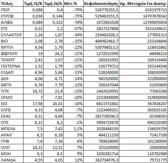 Ο Αύγουστος αφήνει το Γενικό Δείκτη με απώλειες 21,73% και τον τραπεζικό δείκτη με πτώση 68,43%, ενώ οι απώλειες σε επιμέρους τραπεζικές μετοχές έφτασαν να ξεπερνούν το 70%, όπως στην Τρ. Πειραιώς και την Eurobank. Ωστόσο, υπήρξαν και μετοχές που γλίτωσαν από την... καταιγίδα όπως οι Lamda Development, Motor Oil, ΟΛΠ και Αεροπορία Αιγαίου.