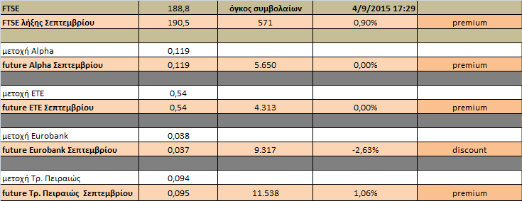 Στα προθεσμιακά συμβόλαια το μεγαλύτερο ενδιαφέρον συγκέντρωσαν οι Τρ. Πειραιώς και Eurobank ενώ το συμβόλαιο επί του δείκτη μεγάλης κεφαλαιοποίησης έκλεισε με premium έναντι του υποκείμενου δείκτη.