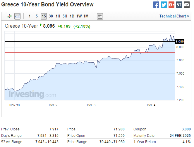 Σε ανοδική τροχιά βρίσκονται για ακόμη μια φορά οι αποδόσεις των ελληνικών ομολόγων, με αυτή του δεκαετούς να αναρριχάται εκ νέου πάνω από το 8% λίγες μέρες μετά την αποκλιμάκωσή του κάτω από το ψυχολογικό όριο του 7%.