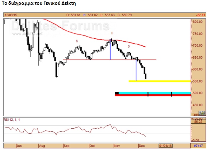 Η ολοκλήρωση της πρώτης φάσης των αναδιαρθρώσεων σε συνδυασμό με τις συνθήκες υπερπώλησης που προκλήθηκαν στις τελευταίες οκτώ συνεδριάσεις σε δείκτες και μετοχές (σ.σ ενδεικτικά ο RSI σε επίπεδο Γενικού Δείκτη και FTSE Large Cap 25 κατέγραψε χθες το χαμηλότερο νούμερο των τελευταίων 13 μηνών) ευνοούν πλέον την εκδήλωση ενός ράλι ανακούφισης στην αγορά, το οποίο πιθανόν θα λάβει επιθετικά χαρακτηριστικά με ισχυρές κινήσεις για τις επιμέρους μετοχές βραχυπρόθεσμα. Είναι επίσης πολύ σημαντική η διαγραμματική παρατήρηση του αναλυτή Στέφανου Γεωργίου (www.deiktes.net) ότι κοντά στο επίπεδο των 550 μονάδων βρίσκεται ο τυπικός στόχος του σχηματισμού "κεφαλής ώμων" που είχε διαμορφωθεί κατά την περίοδο Σεπτεμβρίου-Οκτωβρίου και συνεπώς στην περιοχή αυτή θα μπορούσε να τερματιστεί το τρέχον καθοδικό σκέλος ανοίγοντας το δρόμο για ένα year end rally.