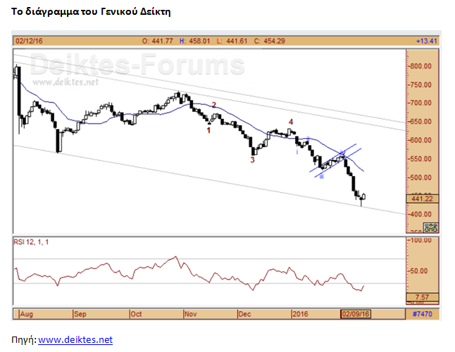 Από τεχνικής και διαγραμματικής πλευράς η εικόνα στο Χρηματιστήριο δείχνει να παραπέμπει σε μια αγορά η οποία αναζητά πλέον τον επόμενο σημαντικό "σταθμό" της πτώσης της, προσδοκώντας πως θα σχηματίσει κάποιον πυθμένα που θα σημάνει τον τερματισμό της μακροχρόνιας απαξίωσης. Το αν αυτός θα είναι στα χαμηλά των 420 μονάδων που καταγράφηκαν την περασμένη εβδομάδας "τοπικός πυθμένας" από τον οποίο ξεκίνησε η ανοδική αντίδραση, ή λ.χ στις 380-390 μονάδες όπου φαίνεται να βρίσκεται ο "τυπικός" στόχος σχηματισμός που διασπάστηκε με την απώλεια των 557-562 μονάδων, "μικρή σημασία" έχει αν πρόκειται πράγματι να ξεκινήσει κάπου εδώ η πολυπόθητη αντιστροφή.
