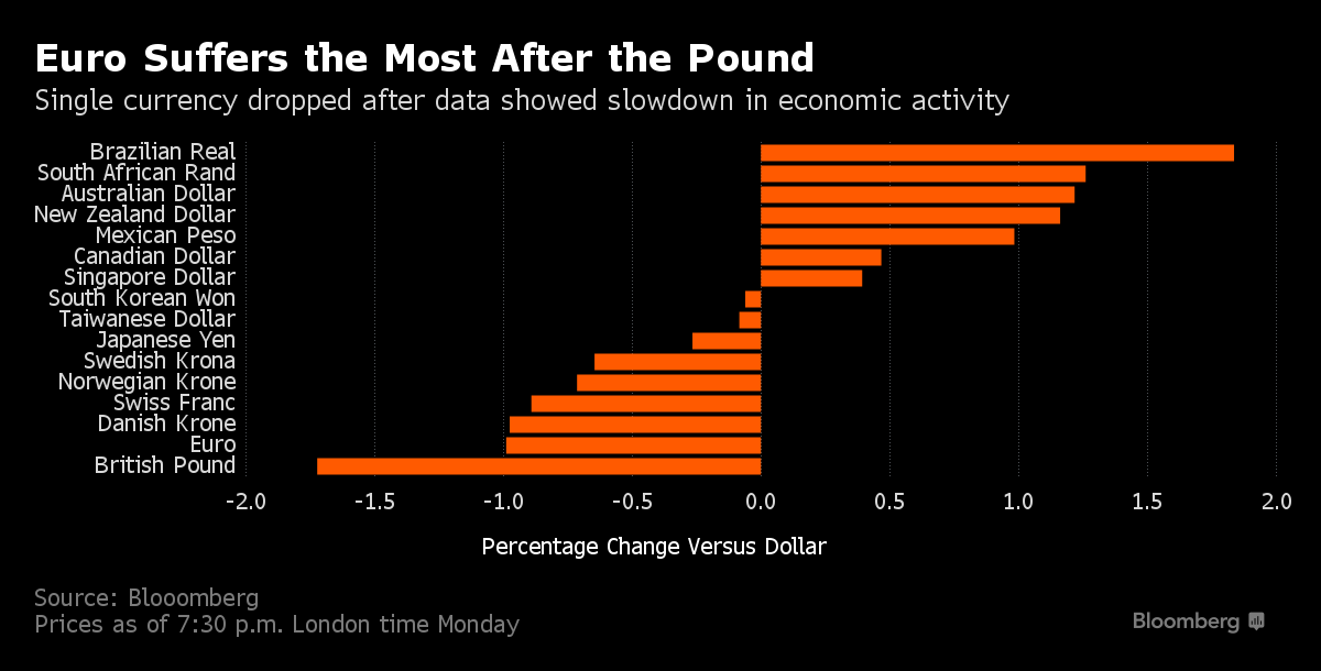 Ειδικότερα, σύμφωνα με το Bloomberg, την ώρα που η λίρα γνώρισε τη μεγαλύτερη πτώση από το 2010, το ευρώ κατέγραφε τις δεύτερες σημαντικότερες απώλειες, υπό το βάρος των ενδείξεων υποχώρησης της ανάπτυξης.