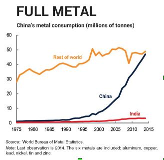 Μεγαλύτερη αισιοδοξία για το μέλλον της Ινδίας τρέφει το ΔΝΤ, κάνοντας λόγο για αλματώδη ανάπτυξη 7,5% φέτος, έπειτα από οικονομική επέκταση 7,3% το 2015. Και ενώ, όπως λέει, η κατανάλωση και οι εισαγωγές άνθρακα της χώρας αναμένεται να αυξηθούν, εντούτοις η οικονομική άνθηση της Ινδίας δεν φαίνεται να καθοδηγεί τις τιμές των μετάλλων. Αυτό, άλλωστε, αποτυπώνεται ξεκάθαρα και στο μερίδιο της χώρας στη διεθνή κατανάλωση μετάλλων, που μπορεί σχεδόν να διπλασιάστηκε τα τελευταία 20 χρόνια (από το 1,9% στο 3,4%), εξακολουθεί, ωστόσο, να παραμένει χαμηλό, ειδικά αν το συγκρίνει κανείς με τη μερίδα του λέοντος της Κίνας. Συγκεκριμένα, το ποσοστό κατανάλωσης μετάλλων της Κίνας εκτοξεύτηκε από το 6,4%, που ήταν το 1990, στο 43,9% το προηγούμενο έτος.
