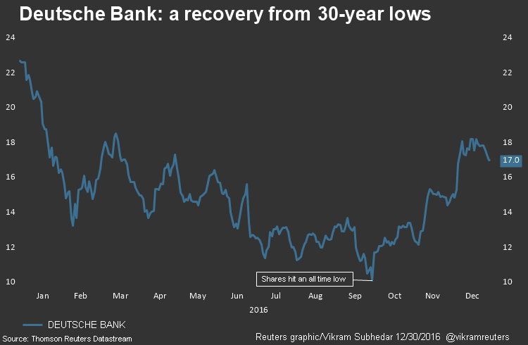 Κλείνοντας το 2016, οι μετοχές του γερμανικού τραπεζικού κολοσσού σημειώνουν απώλειες κοντά στο 20% από τις αρχές του έτους. Αλλά η ανάκαμψη από τα ιστορικά χαμηλά επίπεδα αγγίζει σήμερα το 75%, ενώ πριν λίγες εβδομάδες άγγιζε ακόμα και το 90%.