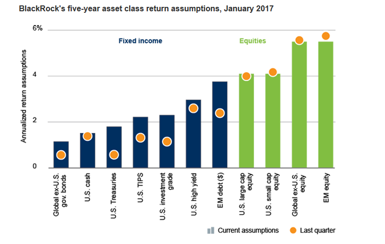 H BlackRock επικαιροποιεί τις προοπτικές της για τις επενδυτικές αποδόσεις και ψηφίζει μετοχές έναντι ομολόγων διεθνώς για τα επόμενα πέντε χρόνια, με βάση την πολιτική αναθέρμανσης της οικονομίας που θα "ξετυλίξει" η προεδρία Trump και τις αλλαγές που έχουν σημειωθεί στις αγορές το τελευταίο τρίμηνο,