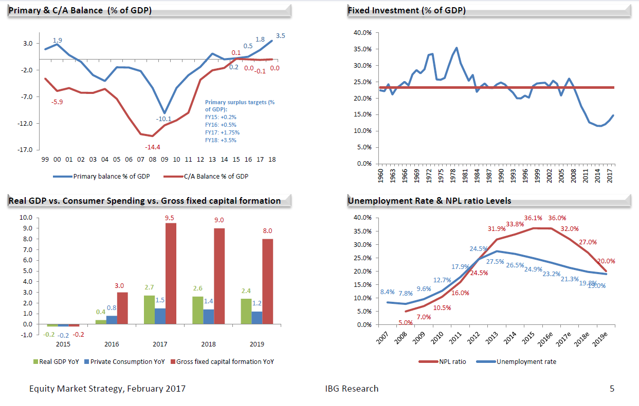 Ειδικότερα, η IBG Research επισημαίνει ότι παρά το γεγονός ότι η ελληνική οικονομία υπόκειται σε κεφαλαιακούς ελέγχους και η κυβέρνηση εφαρμόζει ένα πρόγραμμα λιτότητας ύψους 4% του ΑΕΠ, υπάρχουν σαφή δείγματα ότι η οικονομία θέλει να αναπτυχθεί. Επίσης, οι επιδόσεις του προϋπολογισμού ήταν πολύ καλύτερες από αυτές που αναμενόταν το 2016.