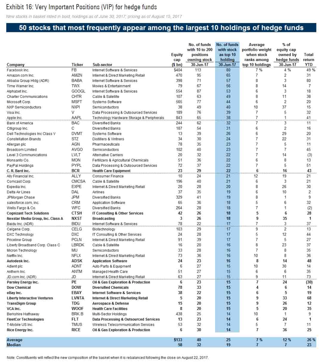 Η VIP λίστα των hedge funds αποτελείται από τις 50 μετοχές που "εμφανίζονται πιο συχνά μεταξύ των 10 τοπ θέσεων στα χαρτοφυλάκια των hedge funds" για το τρίμηνο που έληξε τον Ιούνιου.