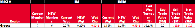 Όπως επισημαίνει, πλέον στον δείκτη MSCI Greece συμμετέχουν μόνον 6 μετοχές από 9 πριν, με το βάρος του στον δείκτη MSCI Αναδυόμενων Αγορών να μειώνεται στο 0,22% από 0,27% πριν, ενώ το βάρος του στον δείκτη MSCI ΕΜΕΑ (Ευρώπης, Μέσης Ανατολή και Αφρικής) μειώνεται στο 1,55% από 1,88% πριν, δηλαδή κατά 0,33%. Μάλιστα, όπως τονίζει, η μείωση του βάρους της Ελλάδας στους διεθνείς δείκτες της MSCI είναι από τα μεγαλύτερα μεταξύ όλων των υπόλοιπων χωρών, με την Τουρκία ( στο 4,18% από 4,57% πριν με μείωση 0,39%) μόνο να ξεπερνά την Ελλάδα. Συνολικά εκτιμά πως οι εκροές από τον δείκτη MSCI Greece λόγω των νέων αλλαγών θα φτάσουν τα 120 εκατ. δολ.