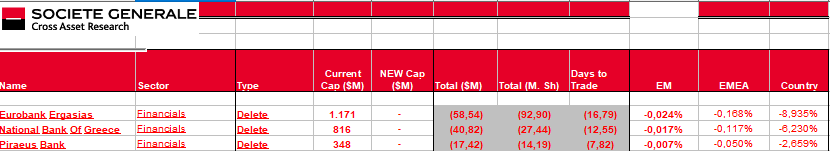 Σύμφωνα με τις επικαιροποιημένες εκτιμήσεις της SocGen, οι εκροές από τις τρεις τράπεζες θα φτάσουν συνολικά τα 116,8 εκατ. ευρώ. Πιο αναλυτικά, οι εκροές από την Eurobank θα φτάσουν τα 58,54 εκατ. δολ ή τις 92,90 εκατ. μετοχές, οι εκροές στην Εθνική θα διαμορφωθούν στα 40,82 εκατ. ευρώ ή στις 27,44 εκατ. μετοχές και στην Πειραιώς οι ρευστοποιήσεις θα αγγίζουν τα 17,42 εκατ. δολ. ή τις 14,19 εκατ. μετοχές. Η Eurobank, τονίζει αποτελεί μία από τα σημαντικότερα deletes από τις αναδυόμενες αγορές μαζί με τις Doha Bank, Dubai Investment, Edp Energias Do Brasi On Gcl Poly Energy, HTC, Macronix International , Odontoprev On, Siemens India και Teco Electric & Mach.