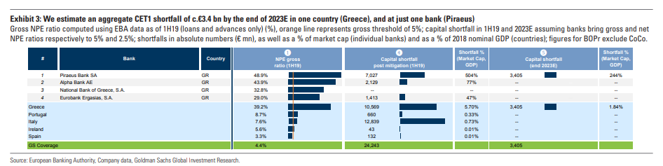 Με βάση την ανάλυση της G.S. το οργανικό "κτίσιμο" κεφαλαίων και ο ρυθμός της μείωσης των NPEs θα αφήσει τις περισσότερες τράπεζες της ευρωζώνης σε καλή θέση για να επιτύχουν αυτούς τους στόχους. Ωστόσο, για τις ελληνικές τράπεζες, μέχρι το τέλος του 2023, η G.S. βλέπει πως θα υπάρξει ένα κεφαλαιακό κενό ύψους περίπου 3,4 δισ. ευρώ (περίπου 1,8% του ΑΕΠ) το οποίο ωστόσο αφορά μόνο μία τράπεζα, την Τράπεζα Πειραιώς.