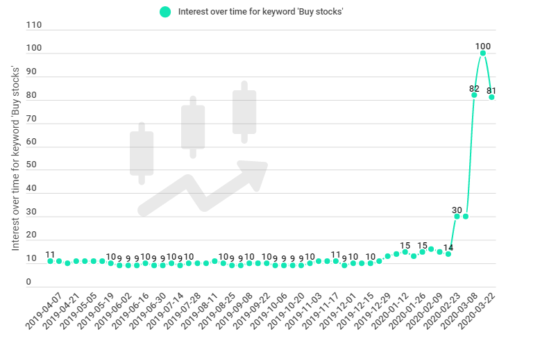 Τα στοιχεία που συλλέχθηκαν από την Learnbonds.com δείχνουν ότι οι αναζητήσεις για μετοχές με σύσταση "αγοράς" σε όλο τον κόσμο αυξήθηκαν τουλάχιστον κατά 466% μεταξύ της 31ης Μαρτίου 2019 και της 27ης Μαρτίου του τρέχοντος έτους. Η εκτίναξη των αναζητήσεων ειδικά το τελευταίο διάστημα συσχετίζεται με τη ραγδαία εξάπλωση του νέου κορονοϊού που έχει οδηγήσει σε μαζικά lockdowns των οικονομιών παγκοσμίως.
