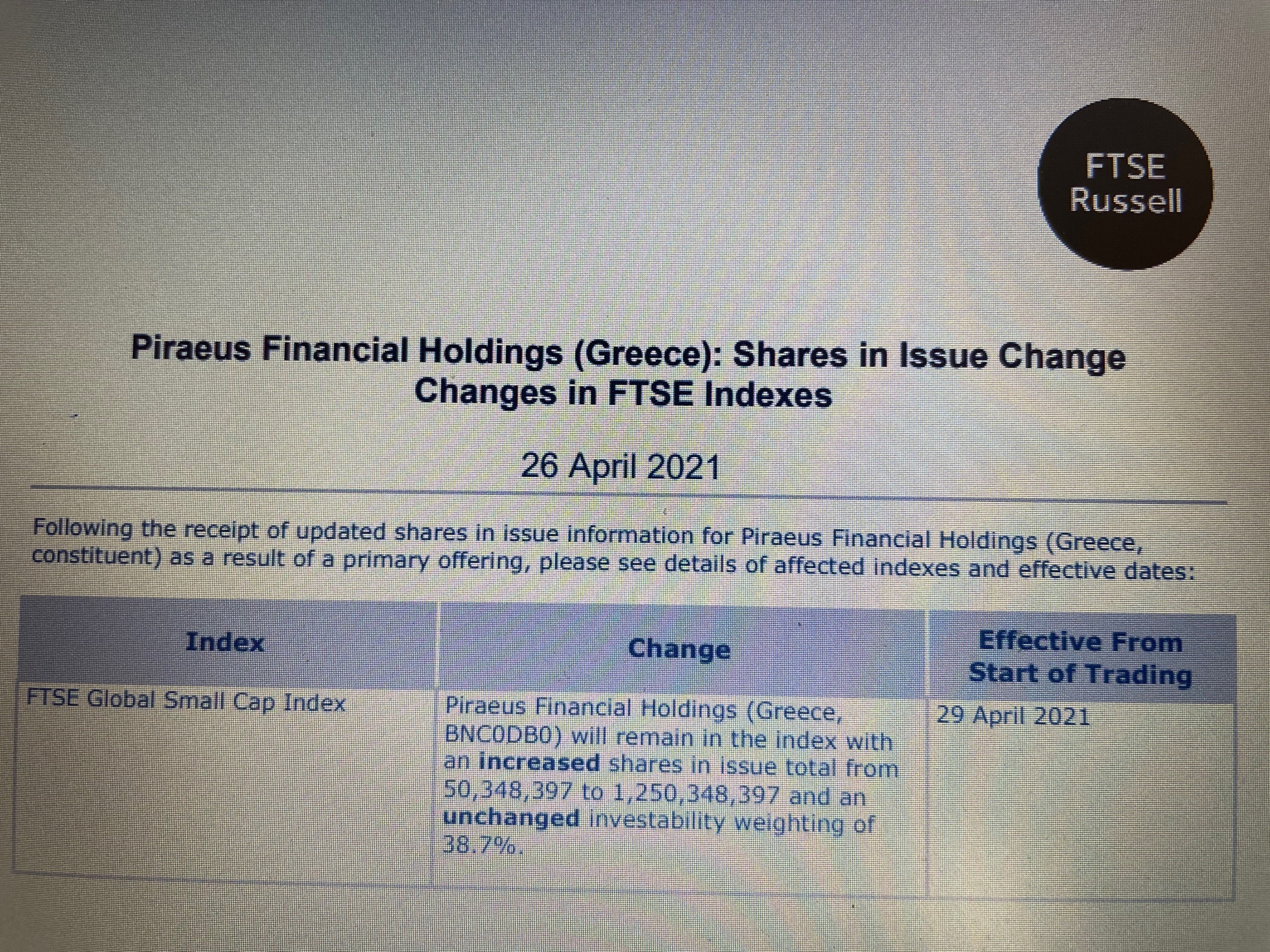 Εν τω μεταξύ σε σημερινή ανακοίνωση του FTSE Rusell αναφέρεται ότι η μετοχή της Τράπεζας Πειραιώς θα συνεχίσει να διαπραγματεύεται στον Global Small Cap Index του FTSE με αυξημένο αριθμό μετοχών (μετά την πρόσφατη ΑΜΚ) και με τη στάθμιση επενδυσιμότητας να παραμένει αμετάβλητη στο 38,7%.