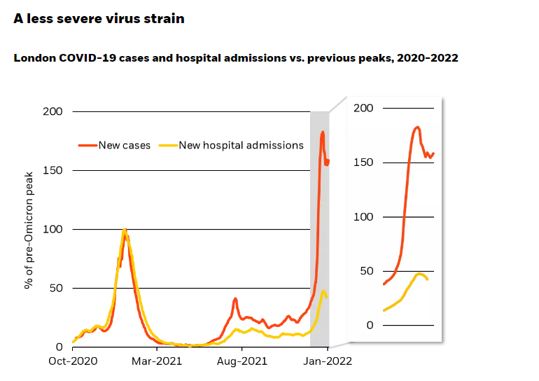 Όλα αυτά υποδηλώνουν αύξηση των κρουσμάτων αλλά πιο μικρή αύξηση των νοσηλειών, όπως επισημαίνει η BlackRock και τονίζει πως η κατάσταση στο πρόσφατο hot spot της Όμικρον, δηλαδή στο Λονδίνο, αποτελεί προάγγελο για τη συνέχεια. Τα κρούσματα αυξήθηκαν έντονα, σε σχεδόν διπλάσια επίπεδα από την προηγούμενη κορυφή στις αρχές του 2021. Ωστόσο, οι εισαγωγές στα νοσοκομεία παρέμειναν 50% κάτω από την προηγούμενη κορυφή, όπως φαίνεται και στο παρακάτω διάγραμμα.