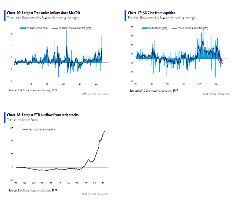 Οι μετοχές, τα ομόλογα, τα μετρητά και ο χρυσός σημείωσαν εκροές την εβδομάδα που έληξε στις 11 Μαΐου, όπως σημειώνουν οι αναλυτές στρατηγικής της BofA επικεφαλής τον Michael Hartnett, επικαλούμενοι στοιχεία της EPFR Global. Οι μετοχές της τεχνολογίας υπέστησαν τις μεγαλύτερες εκροές τους μέχρι στιγμής φέτος οι οποίες άγγιξαν το 1,1 δισ. δολάρια, δεύτερες μετά τις τράπεζες, οι οποίες έχασαν 2,6 δισεκατομμύρια δολάρια.