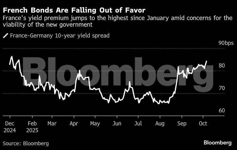 Το premium που απαιτούν οι επενδυτές για τη διακράτηση των γαλλικών ομολόγων έναντι των γερμανικών αυξήθηκε σε υψηλό 10 μηνών, μετά την ανακοίνωση της νέας κυβέρνησης στη Γαλλία και, έπειτα από σχεδόν 12 ώρες, την παραίτηση του πρωθυπουργού, και άρα πτώση της τρίτης κυβέρνησης της Γαλλίας μέσα σε ένα χρόνο.