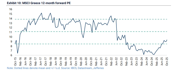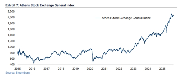 Αν οι σημαντικότερες επιτυχίες μέχρι στιγμής ήταν το δημοσιονομικό πλεόνασμα και η ψηφιοποίηση του διοικητικού κράτους, η ανάπτυξη έχει επίσης επιστρέψει, γι' αυτό και η χρηματιστηριακή αγορά έχει σημειώσει εντυπωσιακή άνοδο, σημειώνει ο οίκος. Η αύξηση του ΑΕΠ προβλέπεται να είναι 2,2% φέτος και 2,4% το επόμενο έτος, ενώ ο δείκτης MSCI Greece διαπραγματεύεται με P/E 12μήνου στο 9,4x. Το βασικό trade για την ελληνική χρηματιστηριακή αγορά ήταν και είναι οι τέσσερις συστημικές τράπεζες, οι οποίες πλέον αντιπροσωπεύουν το 69,1% του δείκτη MSCI Greece και έχουν τρέξει σχεδόν 400% τα τελευταία χρόνια.