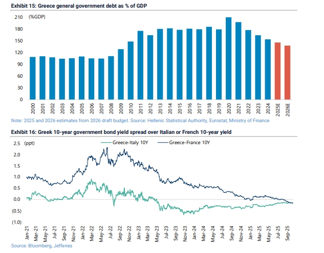 Εάν η Ελλάδα είναι πλέον έτοιμη να επιταχύνει τη δυναμική ανάπτυξής της, παραμένει το πρόβλημα που προέκυψε από την αναγκαστική ανακεφαλαιοποίηση του τραπεζικού συστήματος το 2012, η οποία προκλήθηκε από την κρίση της Ευρωζώνης, παρατηρεί η Jefferies. Αυτό είναι ο δείκτης δημόσιου χρέους προς ΑΕΠ, ο οποίος κορυφώθηκε στο 209,4% το 2020. Τώρα προβλέπεται να μειωθεί στο 137,6% του ΑΕΠ στο τέλος του 2026, με τη βοήθεια του δημοσιονομικού πλεονάσματος, το οποίο θα τοποθετήσει την Ελλάδα κάτω από την Ιταλία σε αυτό το μέτρο, τονίζει η Jefferies. Για αυτούς τους λόγους, το ελληνικό δεκαετές κρατικό ομόλογο διαπραγματεύεται τώρα κάτω από την Ιταλία και τη Γαλλία σε όρους απόδοσης.