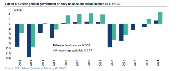 Η Jefferies βρέθηκε στην Αθήνα και πάλι αυτή την εβδομάδα όπου είχε συναντήσεις με ανώτερα κυβερνητικά στελέχη και εταιρείες και όπως τονίζει είναι αυτονόητο για την ίδια ότι η σημερινή κυβέρνηση της Νέας Δημοκρατίας, που επανεξελέγη τον Ιούνιο του 2023 για μια ακόμη τετραετή θητεία, έχει σημειώσει σημαντική πρόοδο στον μετασχηματισμό της οικονομίας. Αυτό ίσως αντικατοπτρίζεται καλύτερα στο γεγονός ότι η Ελλάδα πέρυσι είχε συνολικό δημοσιονομικό πλεόνασμα 1,3% του ΑΕΠ, όπως επισημαίνει.