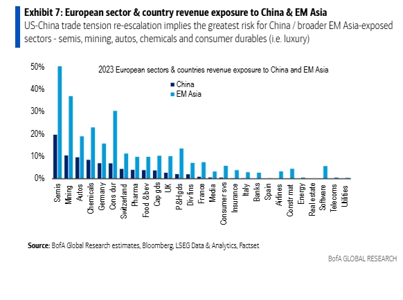 Στο bear σενάριο πάντως, ο κίνδυνος για τις ευρωπαϊκές εταιρείες που έχουν έκθεση στην Κίνα και ευρύτερα σε τομείς που εκτίθενται στις αναδυόμενες αγορές της Ασίας - ημιαγωγοί, εξόρυξη, αυτοκίνητα, χημικά και είδη πολυτελείας, είναι πολύ μεγαλύτερος. Όλοι αυτοί οι τομείς παρουσίασαν υποαπόδοση όταν ανακοινώθηκε η απειλή δασμών. Οι ημιαγωγοί παρουσίασαν τη σημαντικότερη υποαπόδοση, δεδομένου ότι οι πιθανοί περιορισμοί στα ορυκτά σπάνιων γαιών της Κίνας (μέρος της αλυσίδας εφοδιασμού της τεχνητής νοημοσύνης) αποτελούν μέρος της τρέχουσας διαμάχης. Ο τομέας λογισμικού παρουσίασε επίσης σημαντική υποαπόδοση, δεδομένων των απειλών γύρω από τους πιθανούς ελέγχους εξαγωγών λογισμικού. Εντωμεταξύ, οι αμυντικοί κλάδοι, όπως επισημαίνει η BofA, θα ωφεληθούν περισσότερο, ιδίως εκείνοι με υψηλή εγχώρια έκθεση στην Ευρώπη, όπως οι τηλεπικοινωνίες και οι επιχειρήσεις κοινής ωφέλειας.