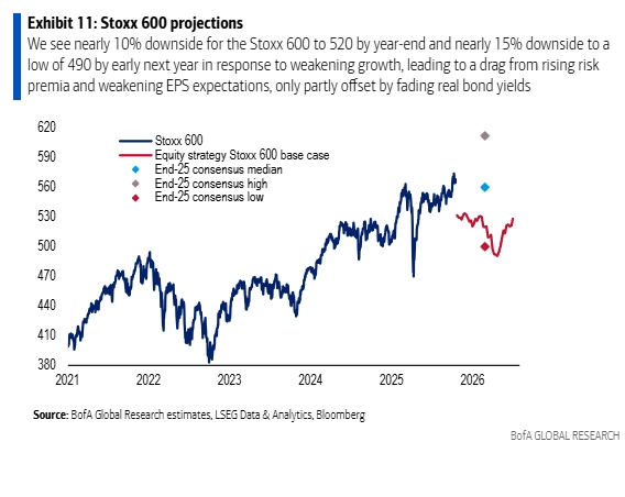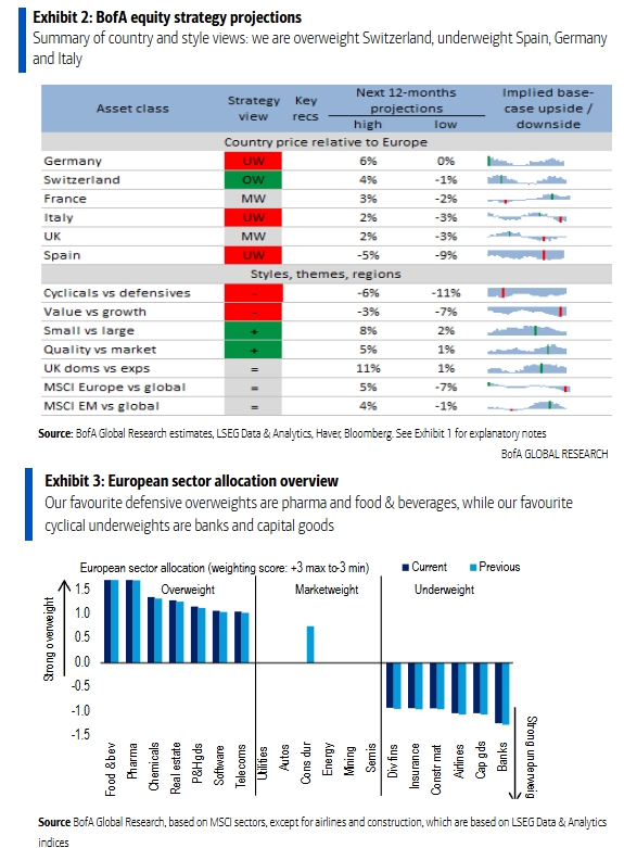 Οι μακροοικονομικές προβλέψεις της BofA για την επιδείνωση της παγκόσμιας ανάπτυξης, υποδηλώνουν περαιτέρω πτώση 7% για τις προσδοκίες για τα κέρδη ανά μετοχή (EPS) του πανευρωπαϊκού δείκτη Stoxx 600 σε σχέση με το ιστορικό υψηλό του Μαρτίου καθώς και ανοδική πορεία για το ασφάλιστρο κινδύνου μετοχών, που μεταφράζεται σε πτώση σχεδόν 15% για τον Stoxx 600 στις 490 μονάδες έως τις αρχές του δεύτερου τριμήνου του επόμενου έτους. Έως το τέλος του 2025 εκτιμά ότι η πτώση θα διαμορφωθεί στο 10% καις τις 520 μονάδες. Παραμένει underweight στις κυκλικές έναντι των αμυντικών μετοχών συνολικά, βλέποντας περισσότερο από 10% πιθανή υποαπόδοση, ενώ οι προτιμώμενοι αμυντικοί κλάδοι της BofA είναι ο φαρμακευτικός και τα τρόφιμα και ποτά, ενώ οι προτιμώμενοι κυκλικοί underweight κλάδοι είναι οι τράπεζες και στη συνέχεια, τα κεφαλαιακά αγαθά.