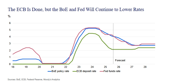 Πράγματι, η ΕΚΤ "φαίνεται" να βρίσκεται σε καλή θέση. Φαίνεται να είναι άνετη με τα τρέχοντα επιτόκια - έχει διατηρήσει το επιτόκιο καταθέσεων αμετάβλητο στο 2% τις δύο τελευταίες συνεδριάσεις - τα οποία βρίσκονται πλέον εντός του ουδέτερου εύρους τους. Η Moody’s δεν προβλέπει περαιτέρω μειώσεις.