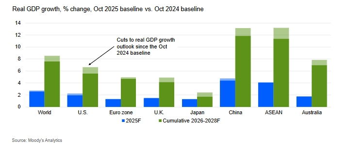 Δυστυχώς, αυτή η συμπεριφορά δεν είναι βιώσιμη και αναμένεται αντιστροφή καθώς οι εταιρείες θα εξαντλήσουν τα αποθέματα που έχουν συσσωρεύσει, όπως προειδοποιεί η Moody’s Analytics. Γι' αυτό και οι προβλέψεις της για το 2026 παραμένουν πιο συγκρατημένες, με επιβράδυνση να αναμένεται στις περισσότερες από τις μεγάλες οικονομίες.