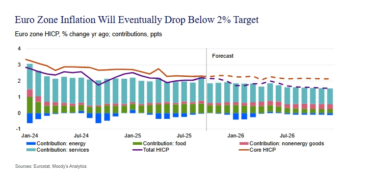 Ωστόσο, σε αντίθεση με τις ΗΠΑ, η ευρωζώνη αντιμετωπίζει σημαντικούς κινδύνους για τον πληθωρισμό. Δεν μπορεί να αποκλειστεί η πιθανότητα υποχώρησης του πληθωρισμού το επόμενο έτος. Το ισχυρό ευρώ αποτελεί κίνδυνο, ειδικά καθώς η μείωση των διαφορών επιτοκίων με την Fed είναι πιθανό να ωθήσει το νόμισμα ακόμη υψηλότερα. Το πολιτικό χάος στη Γαλλία και η επίμονη αδυναμία στη Γερμανία και σε άλλες μεγάλες οικονομίες επιδεινώνουν την απαισιοδοξία. Υπάρχουν αυξανόμενες ενδείξεις εκτροπής του εμπορίου - προϊόντα που προηγουμένως ήταν δεσμευμένα στην αγορά των ΗΠΑ καταλήγουν στις ακτές της Ευρώπης, με έκπτωση - ενώ η πλήρης έκταση των αρνητικών επιπτώσεων των δασμών εξακολουθεί να είναι ασαφής.