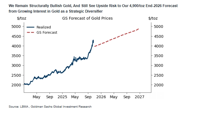 Ο χρυσός ενισχύθηκε κατά 26% από τον Σεπτέμβριο έως την περασμένη Δευτέρα, φτάνοντας στο ρεκόρ των 4.378 δολαρίων/ουγγιά, προτού υποχωρήσει σημαντικά το τελευταίο διήμερο. Η Goldman Sachs πιστεύει ότι οι επίμονες, διαρθρωτικές αγορές των funds θα συνεχιστούν περαιτέρω και εξακολουθεί να βλέπει ανοδικό κίνδυνο για την πρόβλεψή της για τα 4.900 δολάρια στο τέλος του 2026 από το αυξανόμενο ενδιαφέρον για τον χρυσό ως στρατηγικό διαφοροποιητή χαρτοφυλακίου.