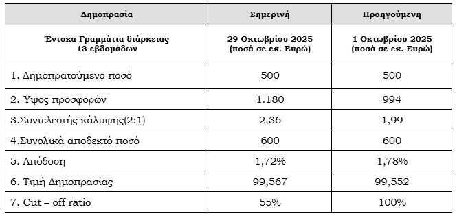 Η απόδοση της έκδοσης διαμορφώθηκε στο 1,72%, υποχωρώντας από το 1,78% της περασμένης αντίστοιχης διαδικασίας (1 Οκτωβρίου).