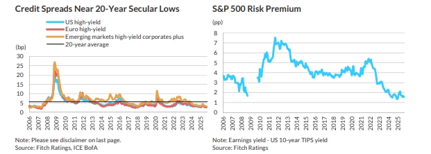 Ωστόσο, όπως προειδοποιεί, η απόκλιση μεταξύ της ευφορίας των αγοριών και των ασταθών οικονομικών προοπτικών και του περιβάλλοντος κινδύνου έχει διευρυνθεί καθώς οι αποτιμήσεις συνέχισαν να αυξάνονται στο γ’ τρίμηνο του 2025. Οι επενδυτές πρέπει να έχουν συνεπώς υπόψη τους πως εντοπίζονται σημάδια οικονομικής επιβράδυνσης στις ΗΠΑ, με την αγορά εργασίας να αρχίζει να αποδυναμώνεται και δείκτες πιστωτικής απόδοσης που σχετίζονται με τους καταναλωτές να δείχνουν σημάδια επιδείνωσης. Η επίδραση των δασμών, αν και χρειάζεται χρόνο, θα γίνει πιο έντονη, ενώ οι ταχείες αλλαγές στα επίπεδα των δασμών και η πιθανότητα αντιποίνων παραμένουν σημαντικοί κίνδυνοι, όπως τονίζει η Fitch. Παραμένουν επίσης βασικές αβεβαιότητες σχετικά με τις διαχρονικές αλλαγές στην πολιτική των ΗΠΑ, τους επίμονους γεωπολιτικούς κινδύνους και το αυξανόμενο δημόσιο χρέος, ενώ αναδύονται άγνωστα στοιχεία σχετικά με μια πιθανή υπερεπέκταση των επενδύσεων που σχετίζονται με την τεχνητή νοημοσύνη και την αύξηση των ιδιωτικών πιστωτικών ανοιγμάτων.