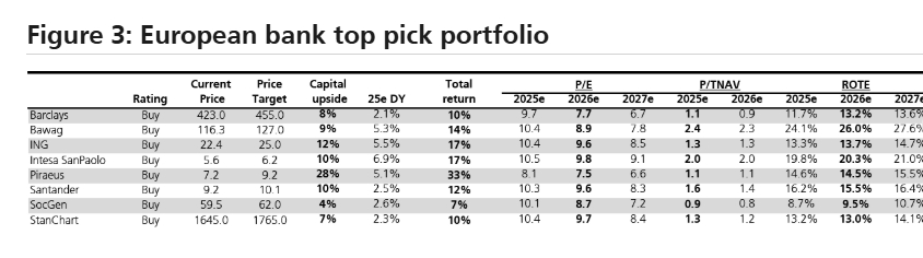 Οι κορυφαίες επιλογές της παραμένουν η Τράπεζα Πειραιώς (μία από τις φθηνότερες τράπεζες στην Ευρώπη, καθαρό play έκθεσης στην Ελλάδα) και η Eurobank (ελκυστικό story εξαγορών, με ακόμα ευελιξία κεφαλαίου).